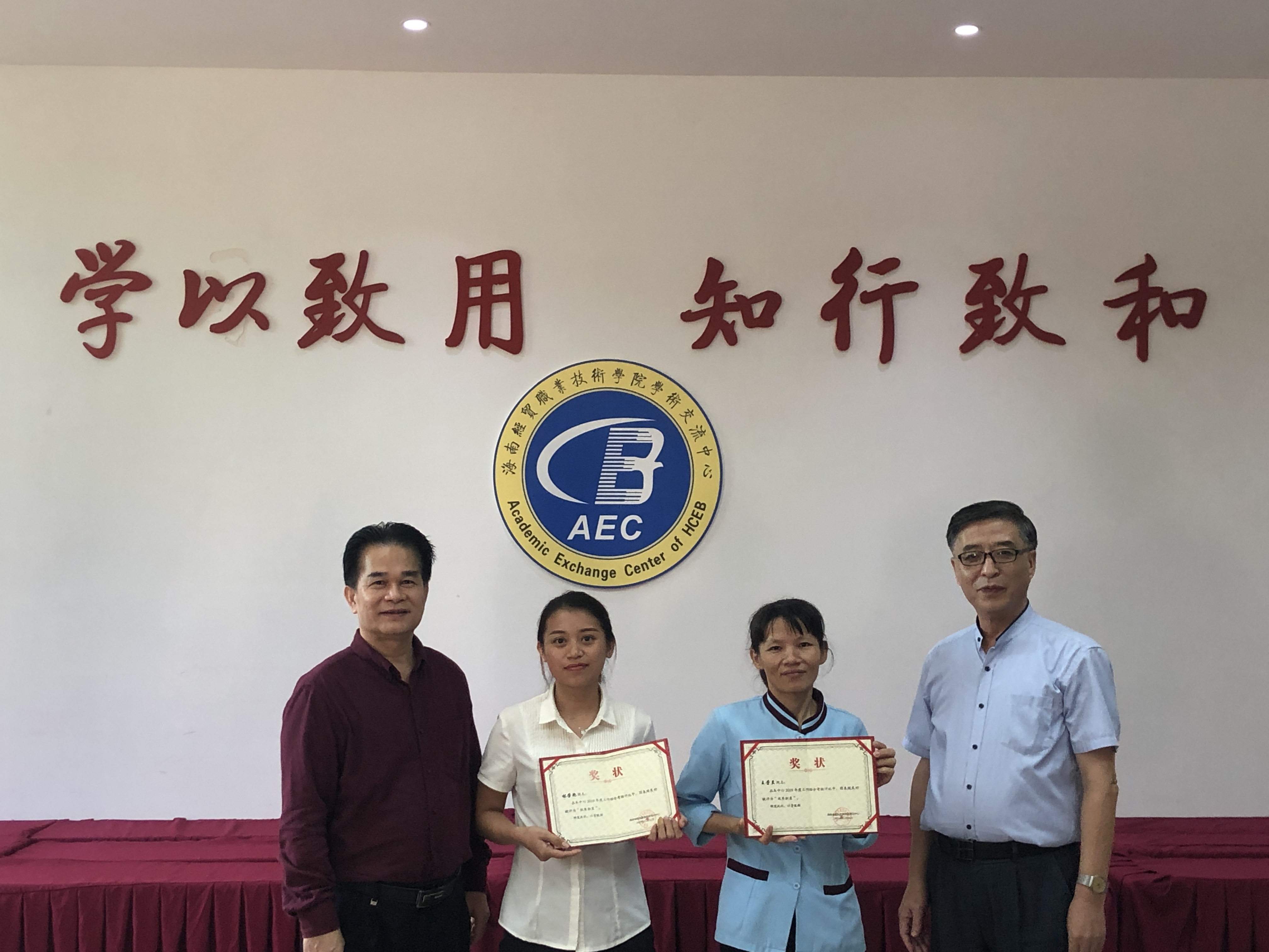 接着,由符海平老师宣读了表彰文件。宾馆经理刘小丽与中心文员史云薇获得“管理新秀”奖,客房部工作人员王兰芳与林芳艳获得“优秀员工”奖,实习生刘小艳和王杨获得“优秀实习生”奖,并由毛江海主任和符海平老师对获得表彰的员工进行了颁奖。