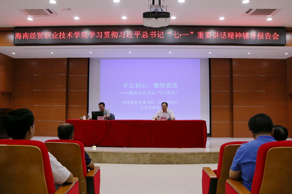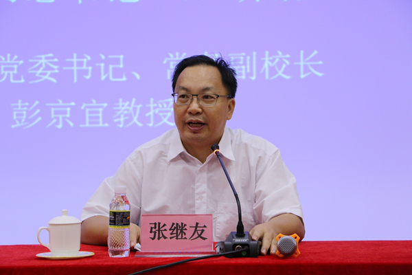 本校11月2日讯(宣传统战部报道)2016年11月1日,中共海南省委党校(省行政学院、省社会主义学院)党委书记、常务副校长彭京宜教授应邀来校,作“不忘初心,继续前进——解读习近平总书‘七一’重要讲话”的专题辅导报告。党委书记张继友,副书记、纪委书记徐畅,党委委员、副院长陈修焕,党委委员、组织人事处处长胡友波出席报告会。报告会由张继友主持。