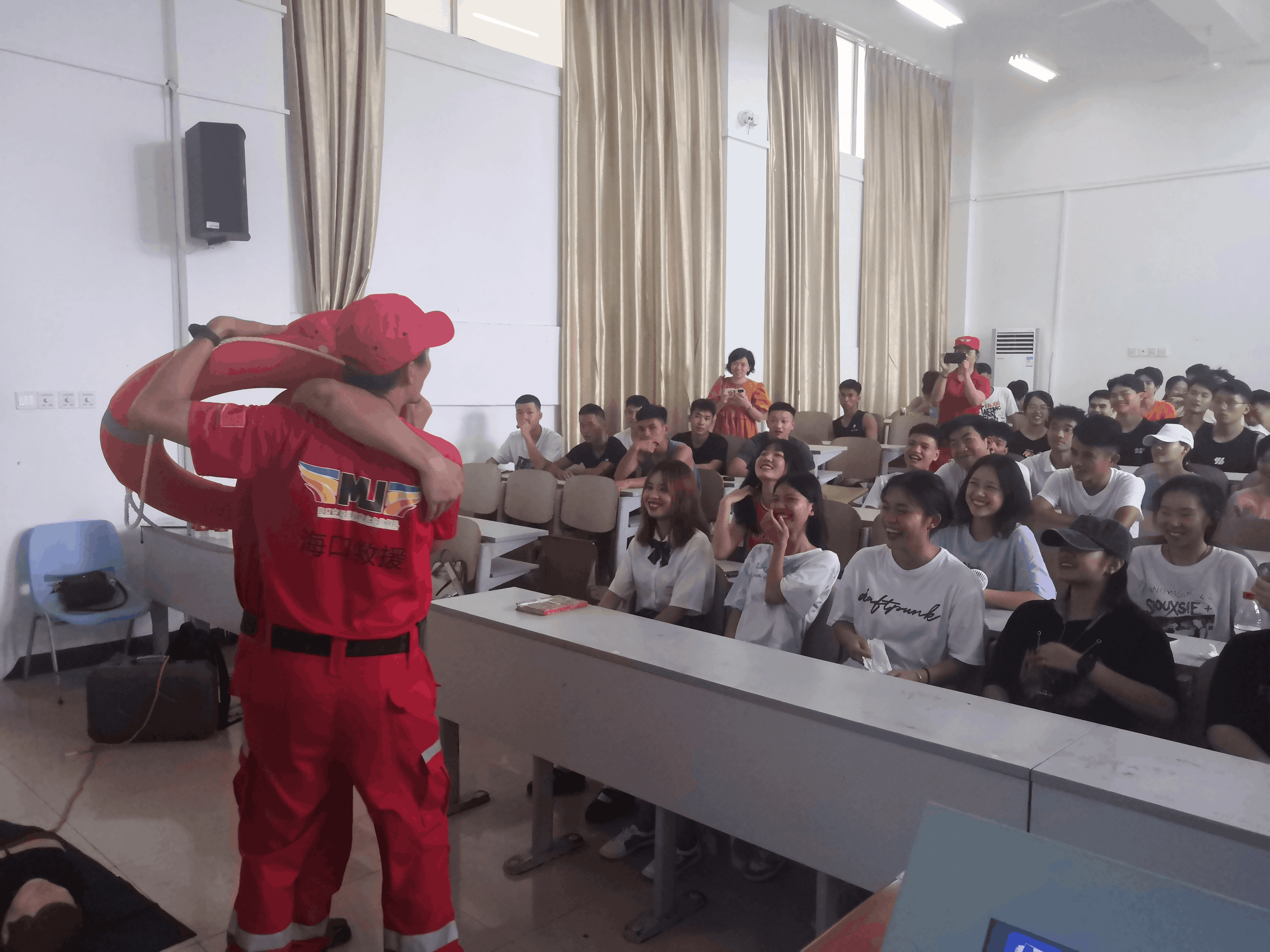 实操部分由海口市民间灾害应急救援队队长郑磊主讲和演示。郑队长和他的团队分析了游泳过程中应注意的问题,模拟了游泳中会遇到的紧急情况,并进行溺水自救和急救演练。