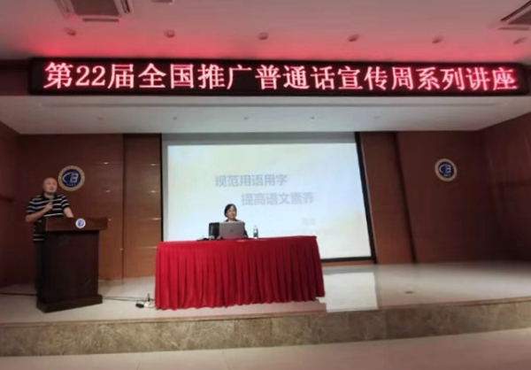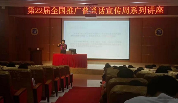 琼台师范学院教授、国家级普通话水平测试员、国家职业汉语能力培训教师、海南省语言文字工作评估专家周萍以“规范用语用字 提高语文素养”为题,从“推广普通话的意义”“生活工作中的用语用字规范”方面为师生作了全面地介绍。